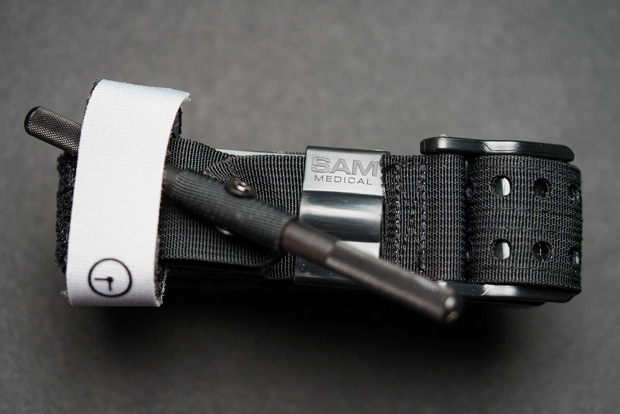 The SAM XT Extremity Tourniquet is intended to be applied around a limb to stop arterial blood flow. It is to be used by first responders on patients with injured extremities to control life threatening bleeding where direct pressure is not effective or is impractical. SAM XT is easy to use: you pull until you hear a distinct "click sound" when enough tension is applied and then you turn the rod until the bleeding stops. SAM XT has a proven effect even when applied on top of winter clothing.