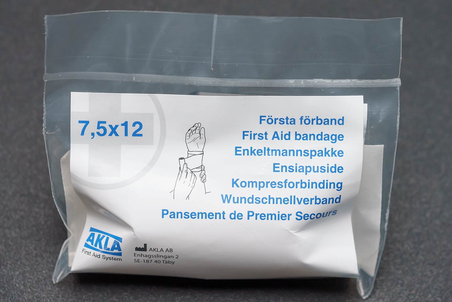 Sterilt första förband som består av 1 non-wovenkompress 7,5x12cm i CELLOSOFT-material som är hudvänligt och ej vidhäftande med fastsydd elastisk binda 2m x 6cm. Tillverkad i Sverige.